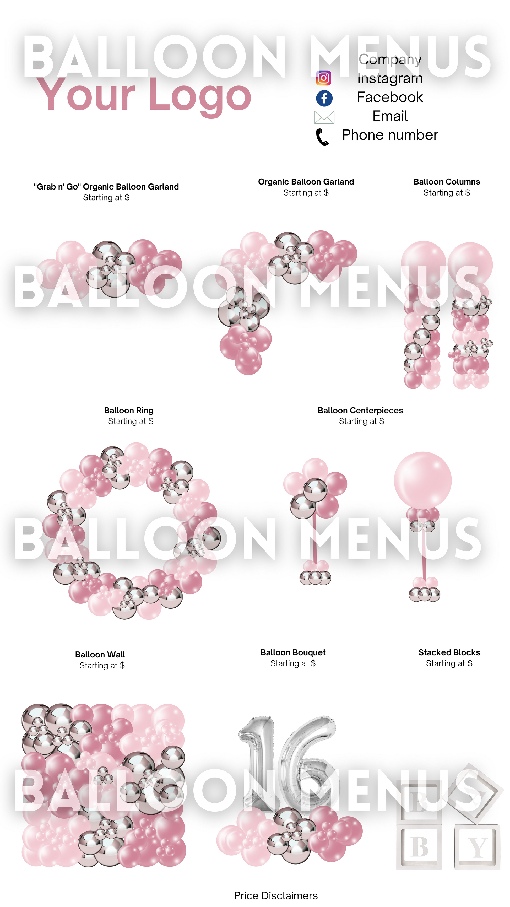 Premade Editable Balloon Menu -Pink ,Blush, Silver