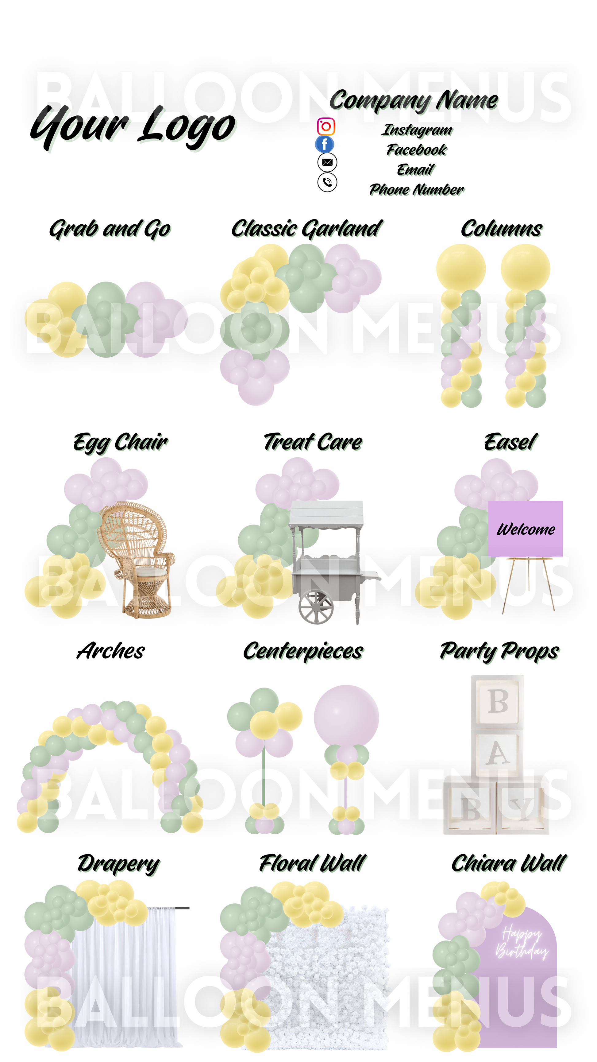 Make party planning easier and effortless with our Digital Balloon Menu! Designed to help party planners showcase their services and give clients a clear preview of offerings, this fully editable menu is a must-have tool for your business!